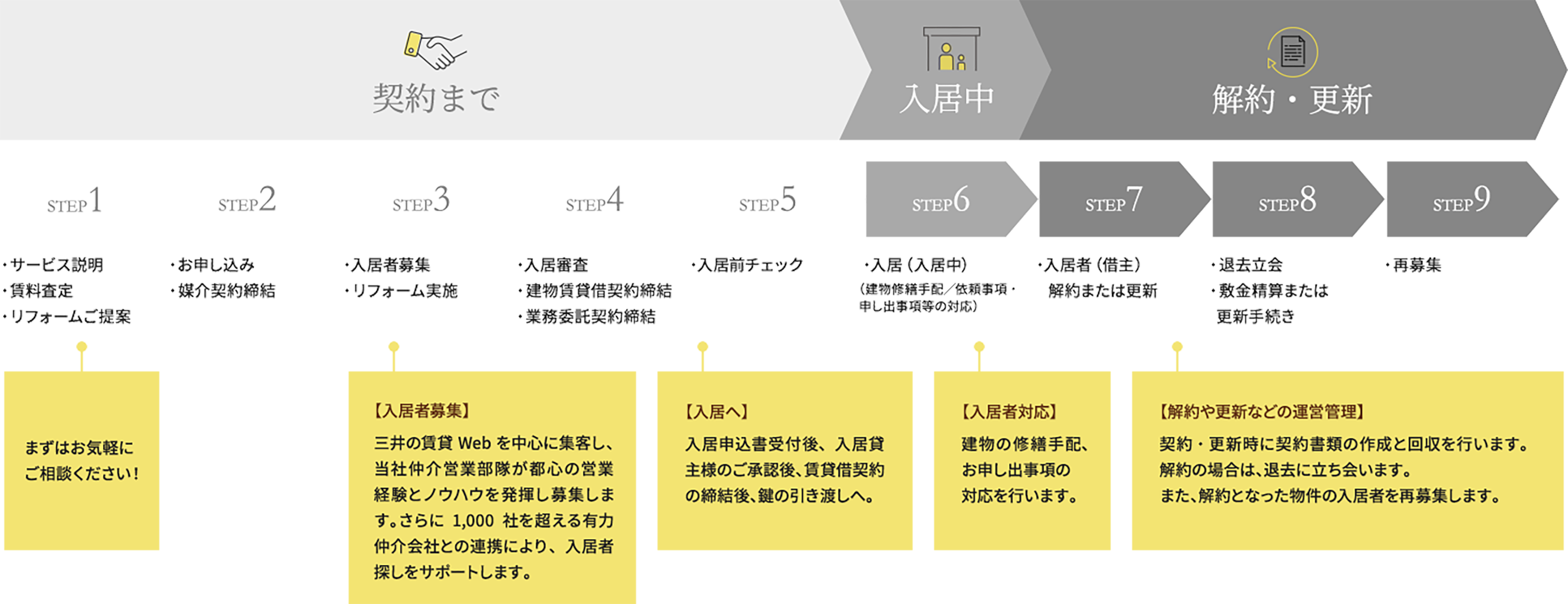 当社専属のプロフェッショナルな仲介チームが、オーナー様の物件の魅力を最大限に引き出し、迅速な成約を実現します。また、マーケティング面ではWEB掲載、写真撮影、ポータルサイト活用など、総合的なサポートを提供しています。安定した運用をご希望のオーナー様には、最適な体制でサポートいたします。